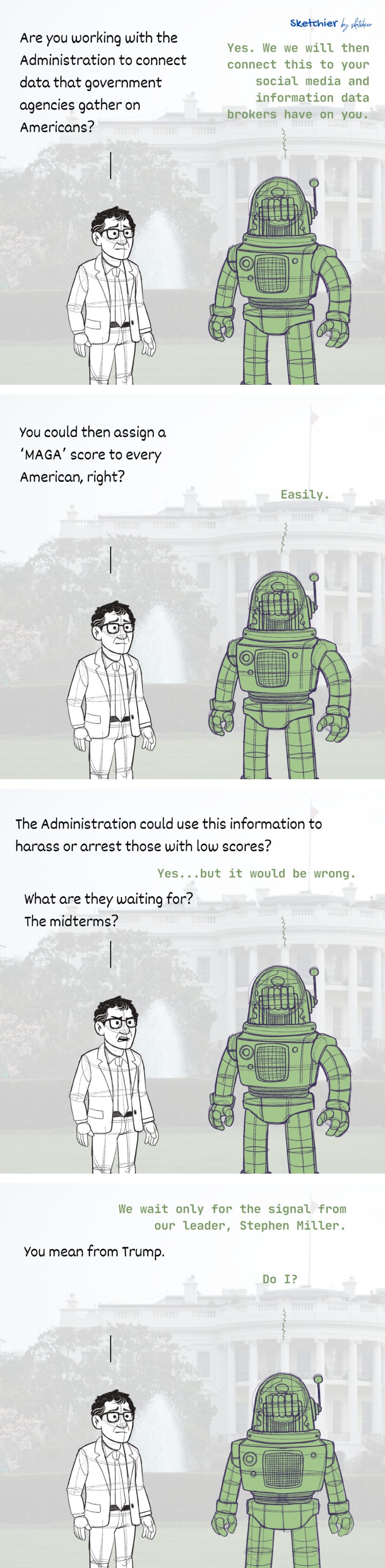 However, the Administration is working with Palantir to connect government databases from the IRS, the Social Security Administration, DHS and others to build a dossier on everyone. Adding information from data brokers, social media, and other private sources is easy. And the Administration is already trying to get their hands on voter rolls. While this is supposedly not part of the plan for “improving government efficiency,” neither was demolishing the East Wing.