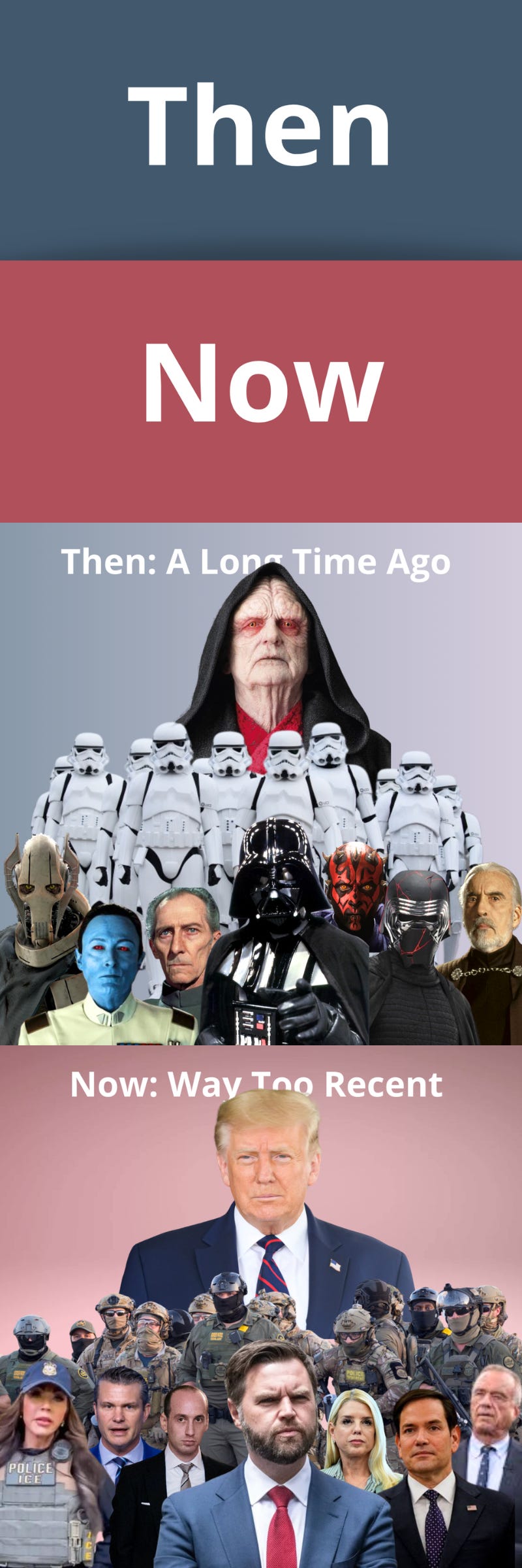 The “Might Makes Right,” we’re the hemispheric bullies, let’s grab territory crowd (AKA, “The Administration”) is acting like the Star Wars prequels. But with real bullets, drones, and troops. This Then and Now points out that no Emperor gets there alone. When it’s time for accountability (think Return of the Jedi), the list will be long.