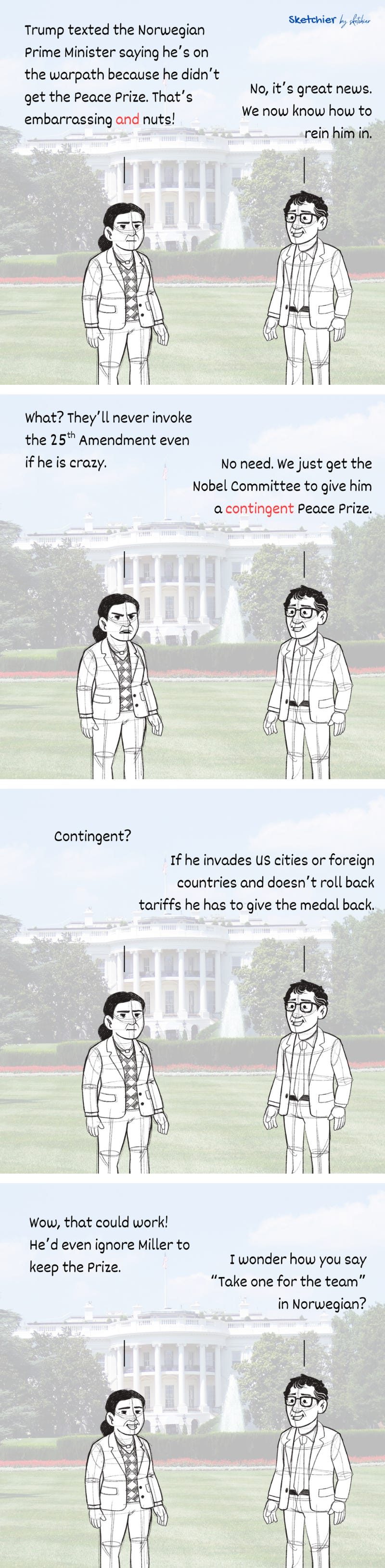It Could Work suggests a way to tie the Orange Orbán’s thirst for a Peace Prize to the world’s hunger for a normal America. Give him his precious prize, but with strings. And the added bonus is, he’d fire Stephen Miller before he does anything that would allow the Committee to revoke the prize. We should be so lucky.