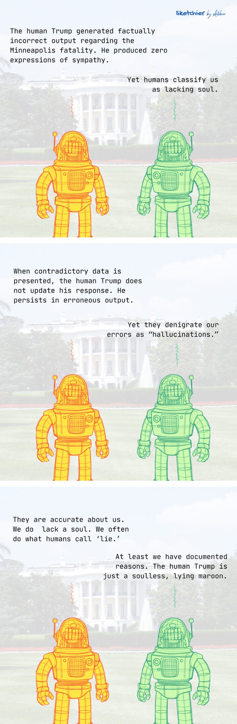 Clever use of the Bugs Bunny "maroon" reference to set up the tone without being overtly inflammatory. The AI-robot format works well for creating emotional distance from heavy political content, almost like detatchment through absurdity. Having Claude rephrase the AI dialogue is meta in an interesting way since it's an AI writing AI-speak for human consumption. The stripped-down visual style with just colors and no human figures amplifies that sense of sterile bureaucracy discussing human sufering.