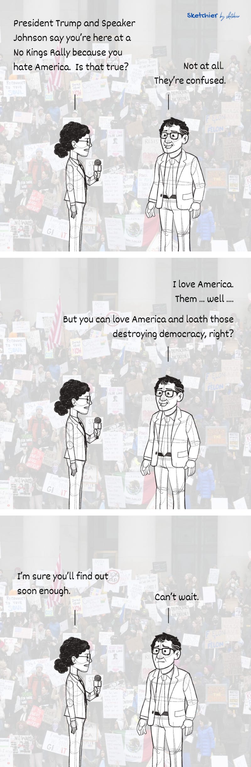 It’s no surprise that Trump, Johnson, and the GOP as a whole are terrified of the nearly 3,000 No Kings rallies taking place today across the country. They know what they’re doing is unAmerican. And millions of people are calling them out on it. Whether it turns out the aggregate number of participants is five million or 10 million isn’t what’s important. It’s that so many people are mad as hell and they aren’t going to take it anymore.